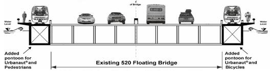 This least costly and more efficient alternative for the bridge crossing Lake Washington between Seattle and Bellevue in Washington State, USA was endorsed by BWR, a large USA transportation consultant. The Urbanaut's two guideways on additional pontoons along the side of the bridge could double the passenger capacity of the current auto traffic. The Urbanaut® unique vehicle bogie innovation prevents uplift and derailment of the vehicle during rocking movements of pontoons in storms, a problem with light rail and other monorails. The cantilever overhang design is a protected innovation by the Urbanaut Company, having the following advantages: 1. In stormy weather the water for the current bridge washes up across the bridge, forcing traffic to slow down and sometimes shut down. The cantilever overhang prevents such from happening. 2. The cantilever costs considerably less in comparison with building additional pontoons. 3. It provides space for bicycles and pedestrians in addition to serving as an emergency evacuation area. 4. It helps stabilize the bridge dynamically, laterally and vertically. 5. It requires less buoyancy area than extra pontoons. The proposed light (heavy) rail for the Lake Washington floating bridge is antiquated, costs taxpayers 3 times more, and is not a futuristic transportation technology. Major metropolitan cities like Paris, Montreal, Mexico City, Taipei and others are changing their steel wheel/steel rail systems to rubber tires, similar to what is applied by the Urbanaut. The reasons are operating costs, noise, limited traction, limited max. grade of 2%, acceleration and braking capabilities.